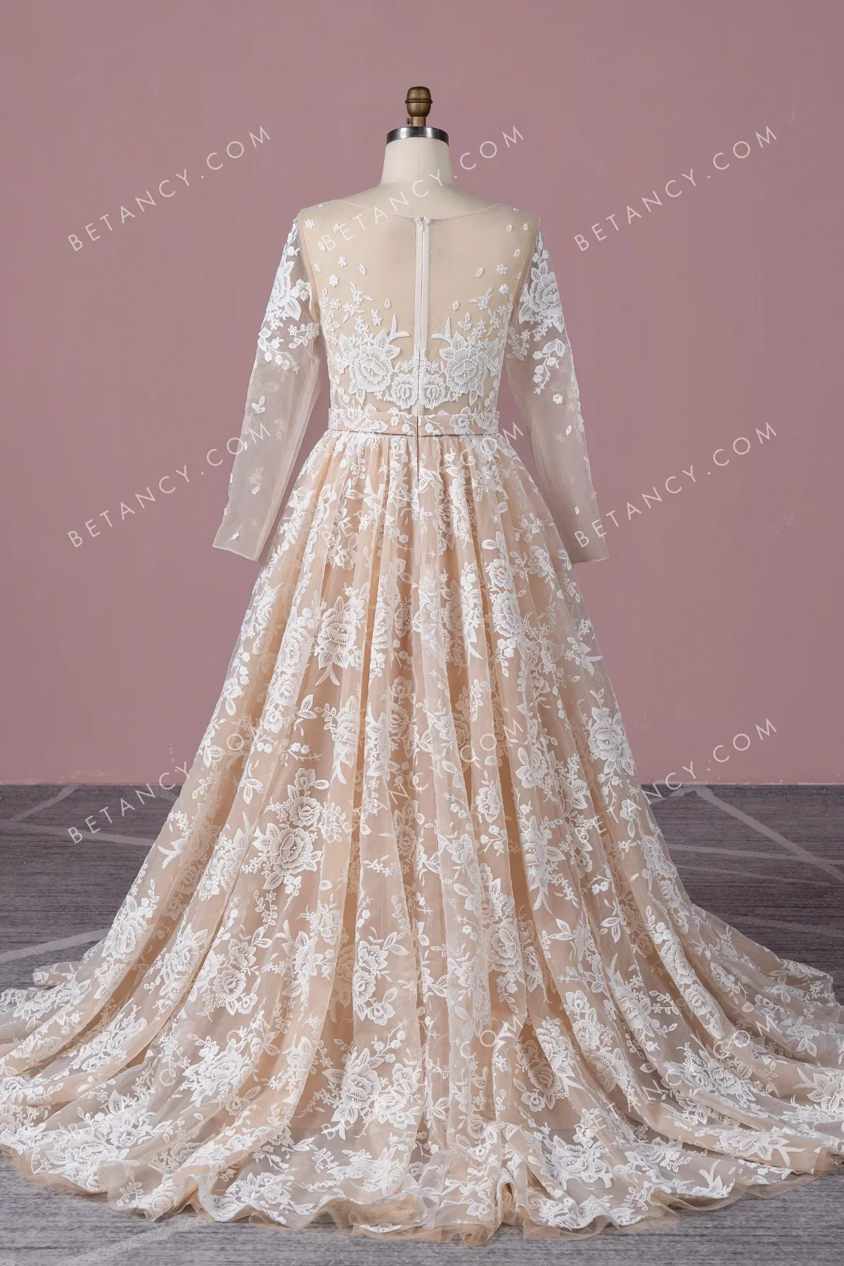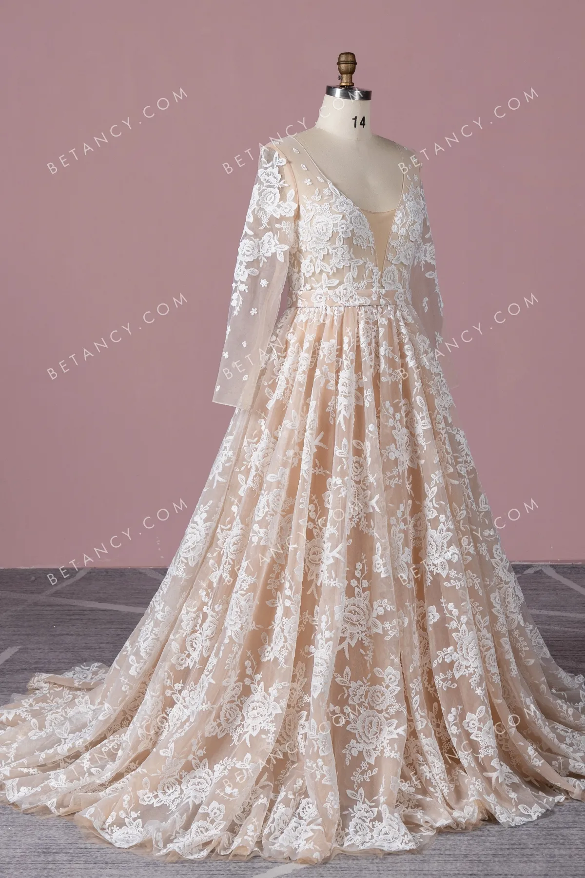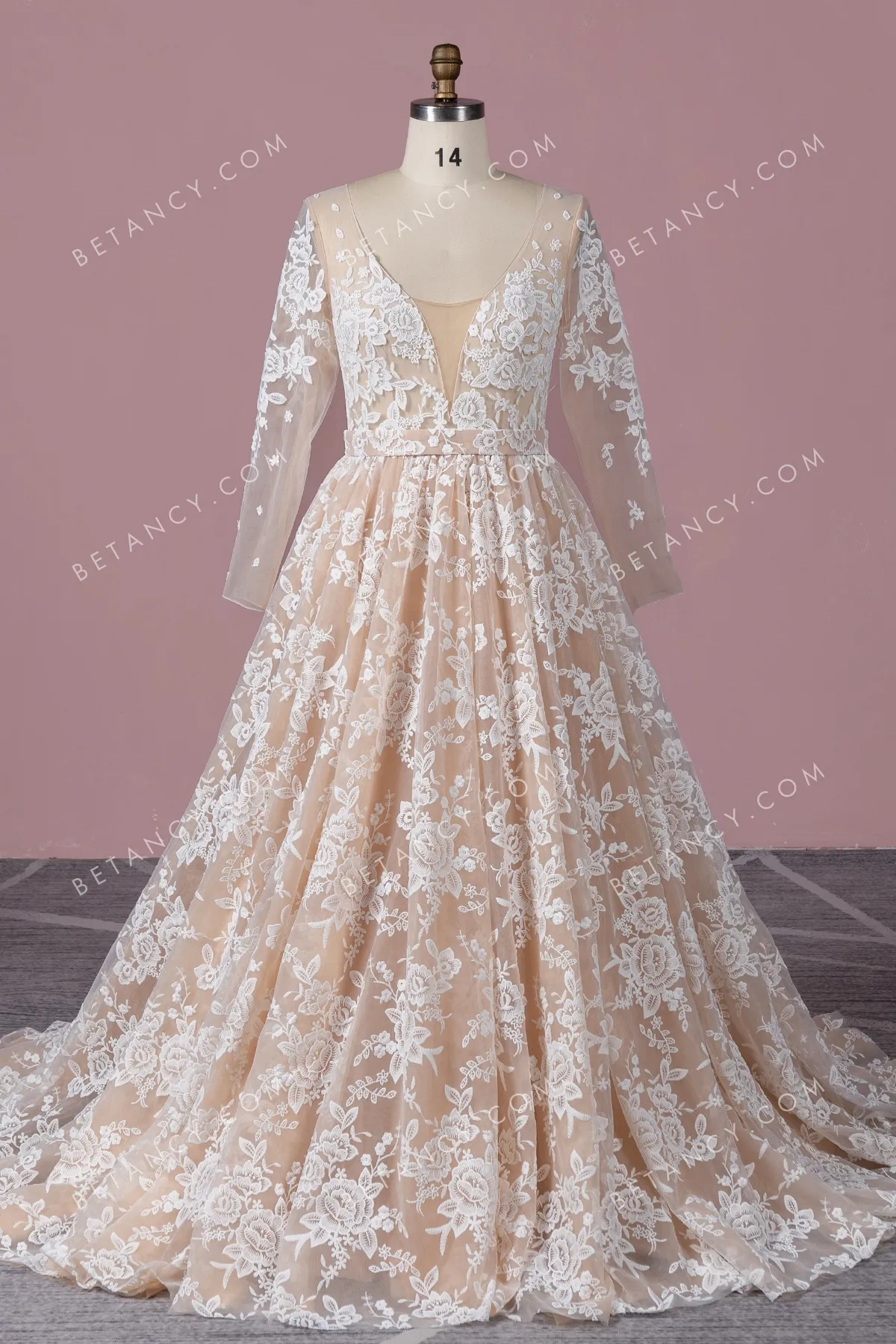Floral Lace Nude Tulle V-neck Long Sleeve Bridal Dress