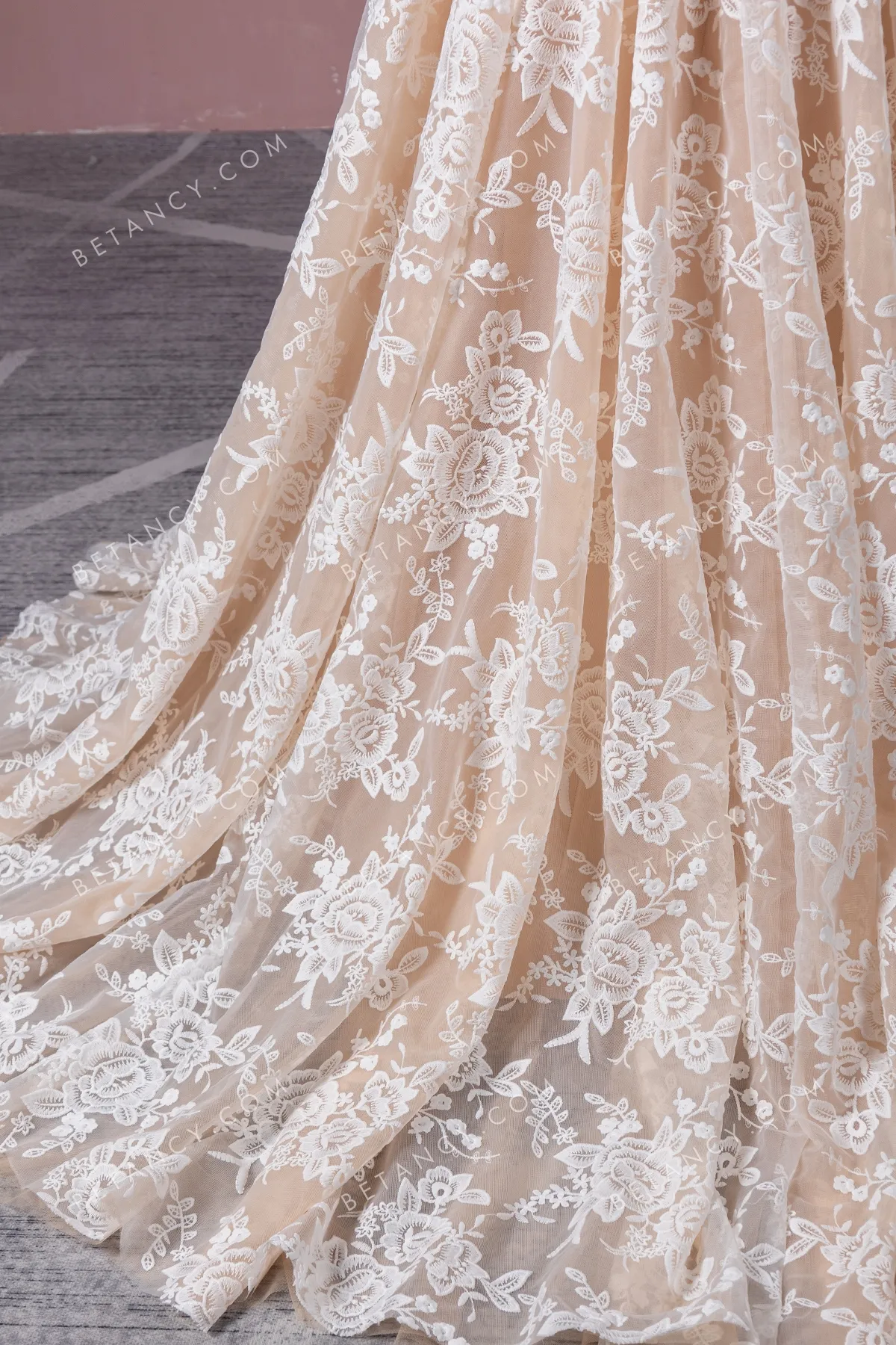 This nude color floor-length bridal gown features a V neckline and long sleeves, offering a romantic and timeless look. The floral lace detailing throughout the nude tulle creates a feminine and delicate aesthetic. The A-line silhouette flatters the figure, while the flowing train adds a touch of drama and elegance.