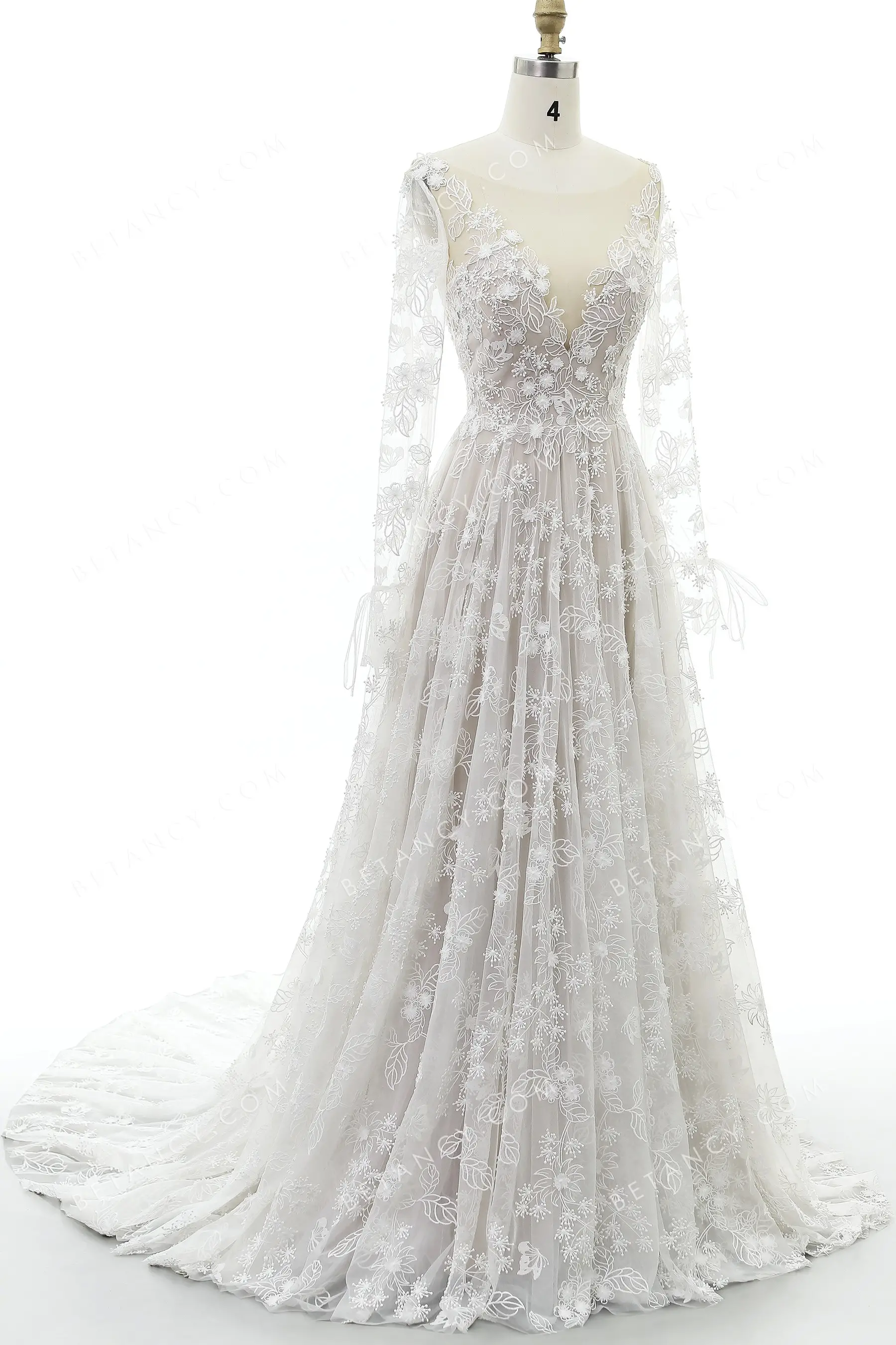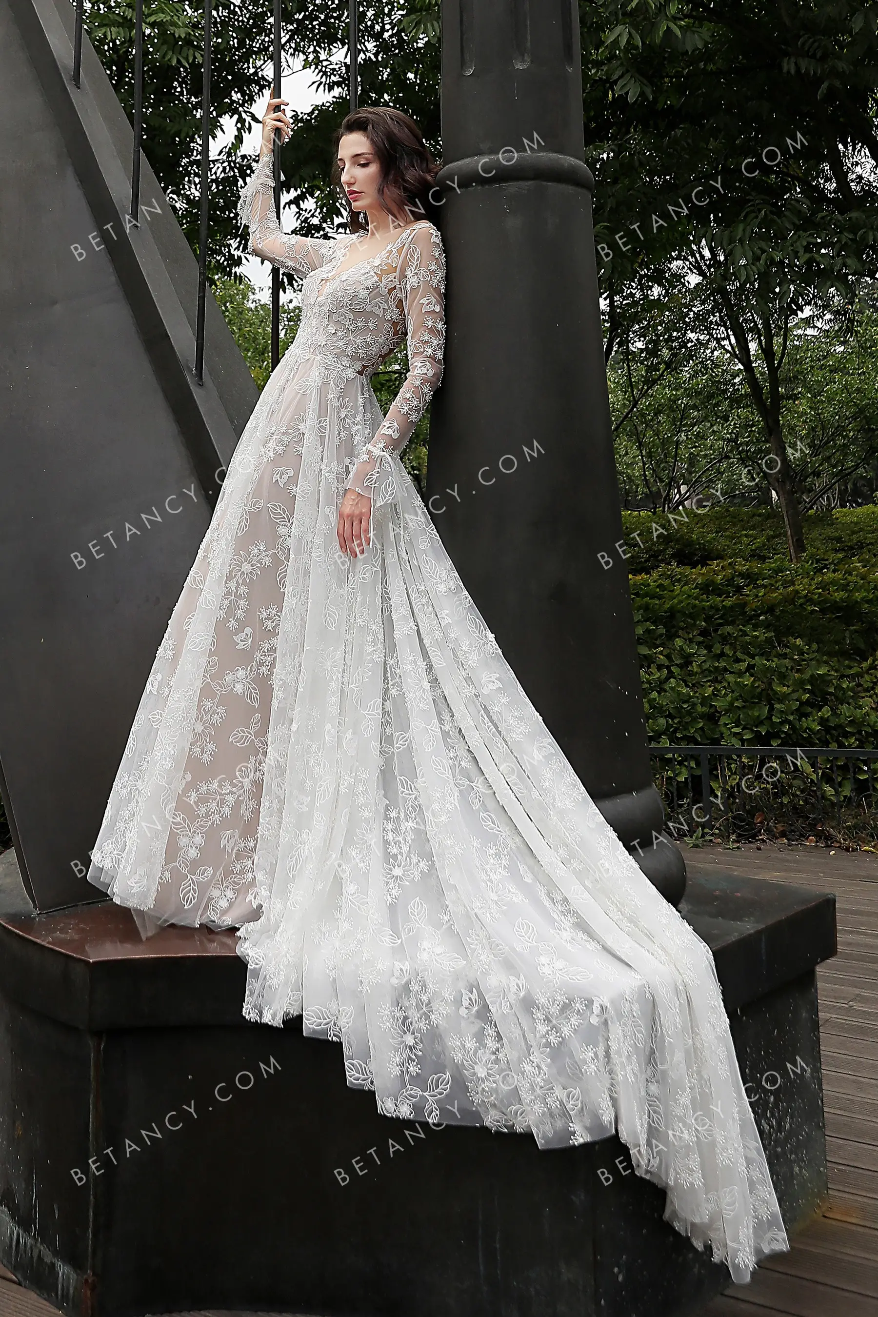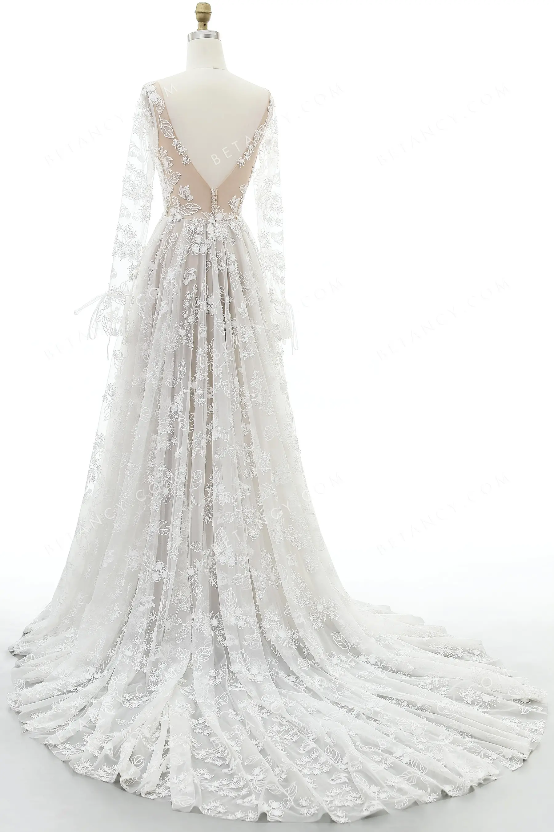 Featuring an illusion V neckline with flare long sleeves and a V-back closed with crystal buttons, accented in vivid flowers and butterflies embroidered lace that pours onto the tulle A-line skirt, this beige wedding dress brings a true romantic vibe.