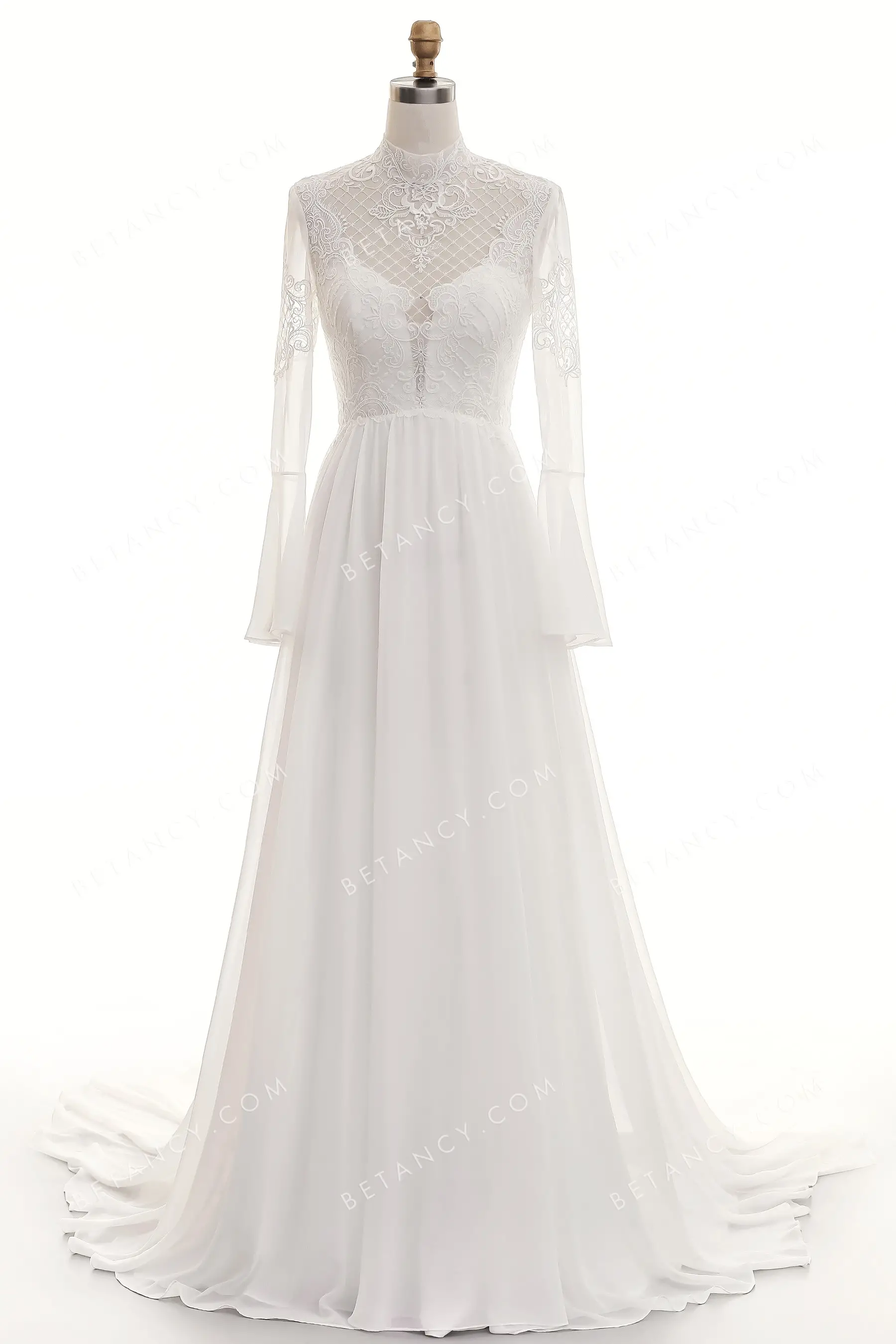 Illusion High-neck Long Bell Sleeve Boho Bridal Dress