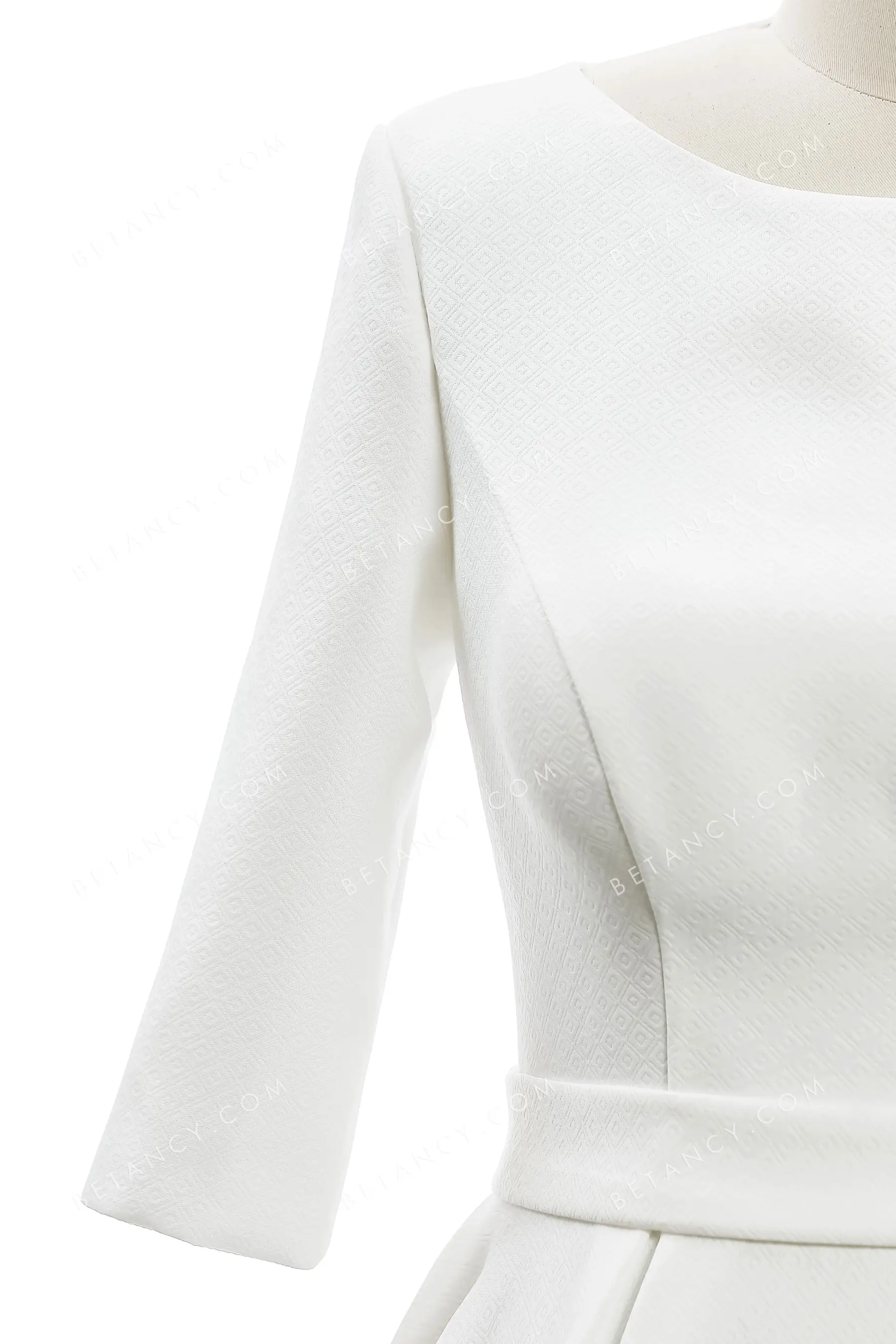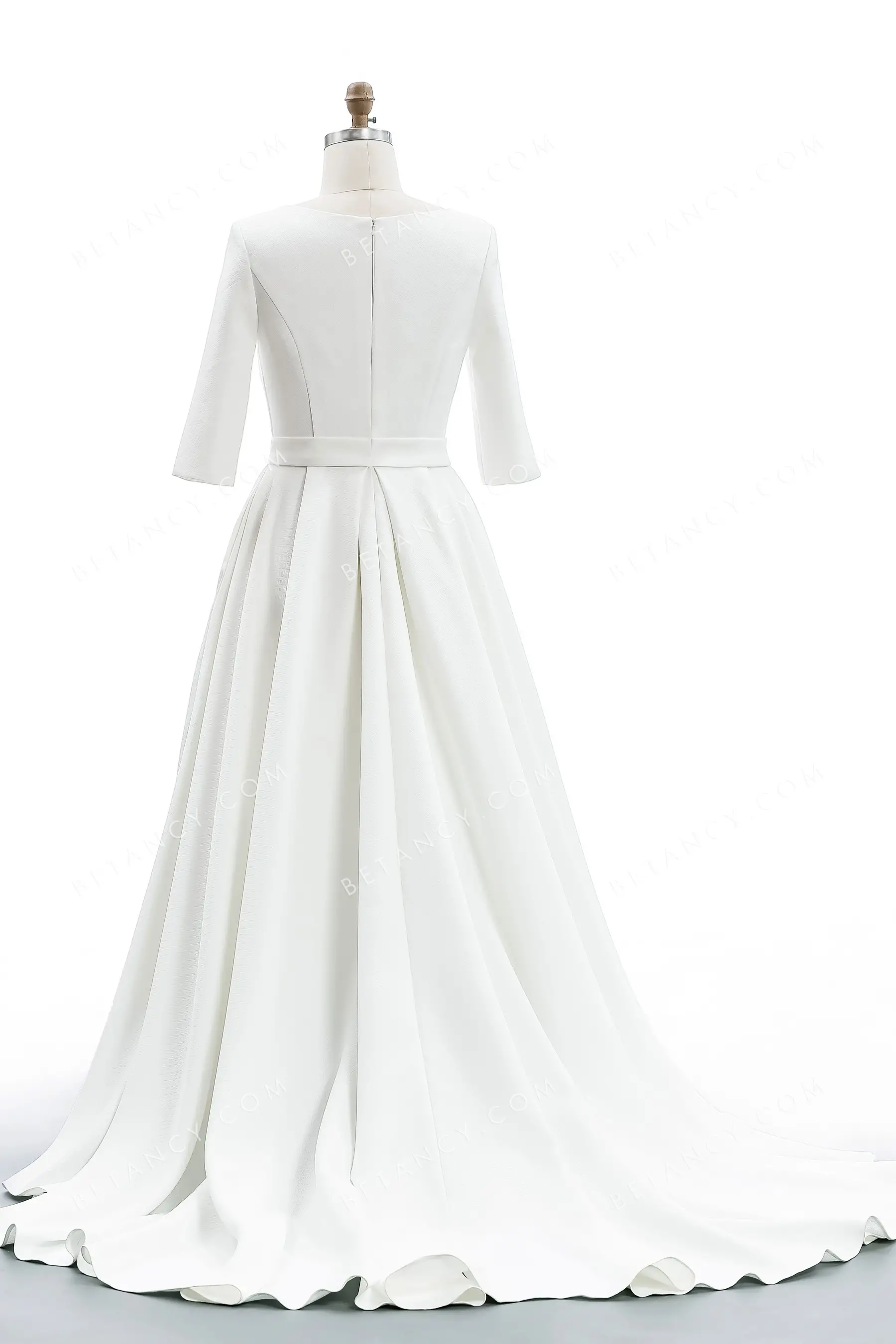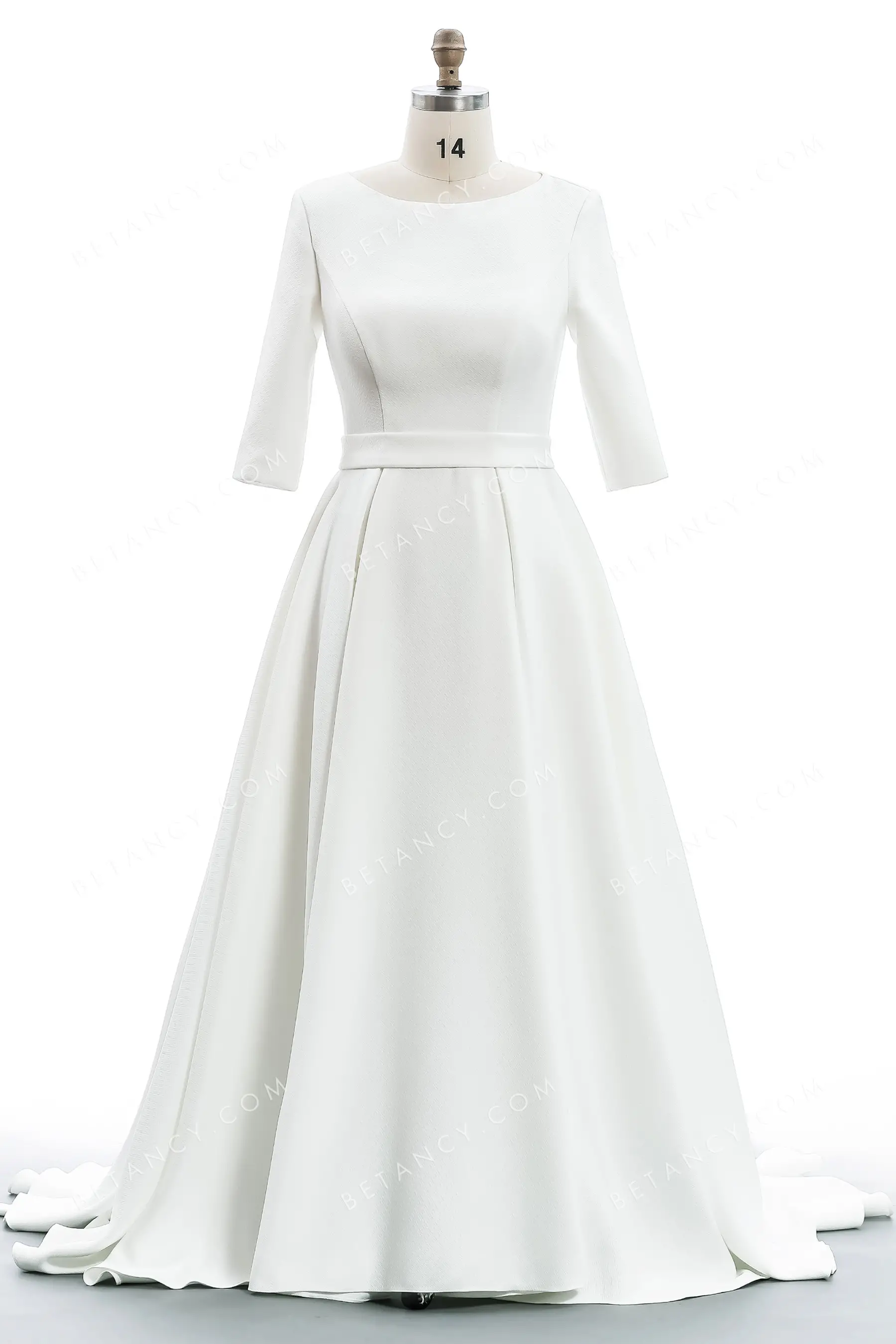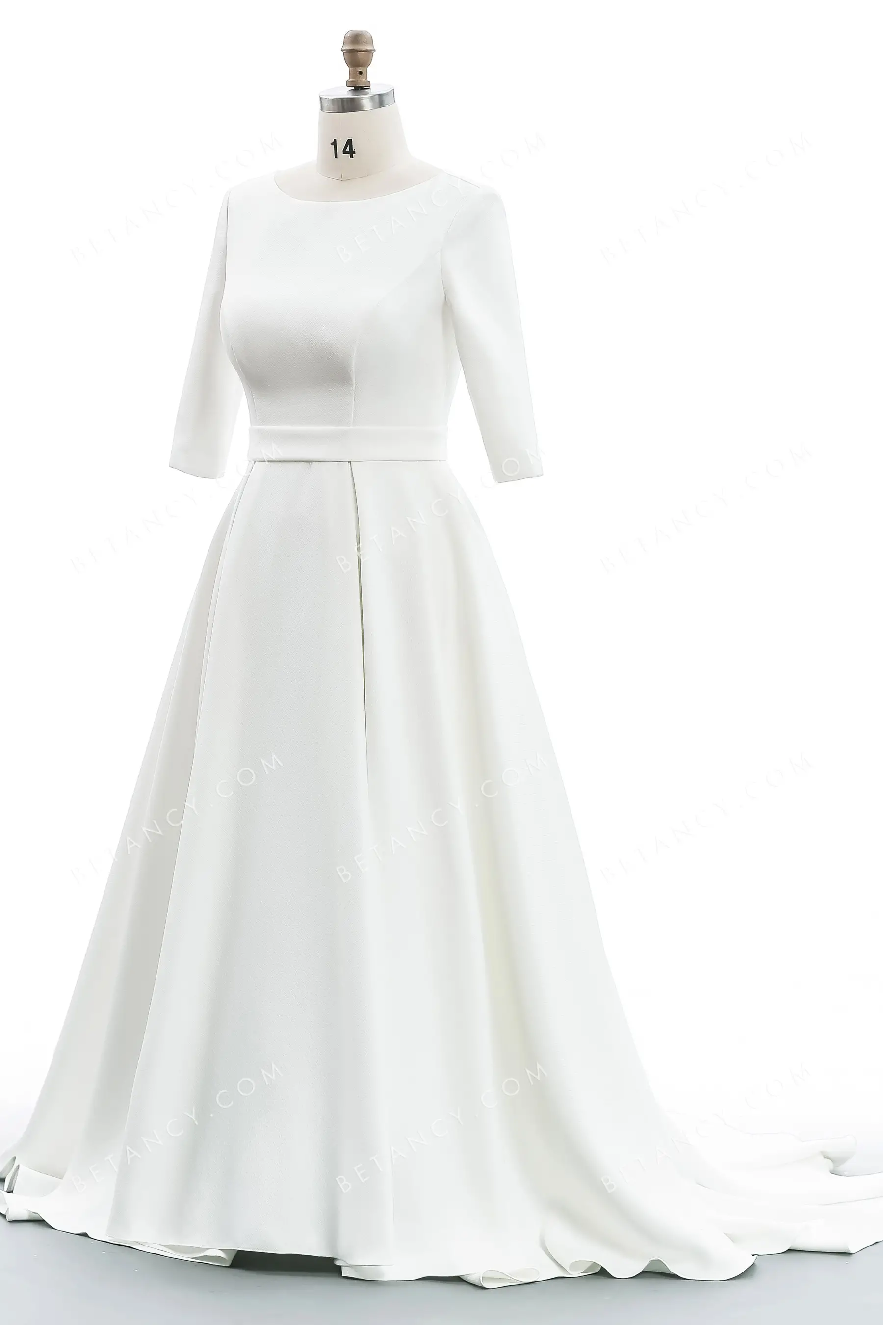 Simple ivory texture satin wedding gown for wholesale. The bateau neckline, 3/4 sleeves, and modest full-back make the bodice decent. The timeless A-line court train skirt falls from the stylish waistband to define the figure.