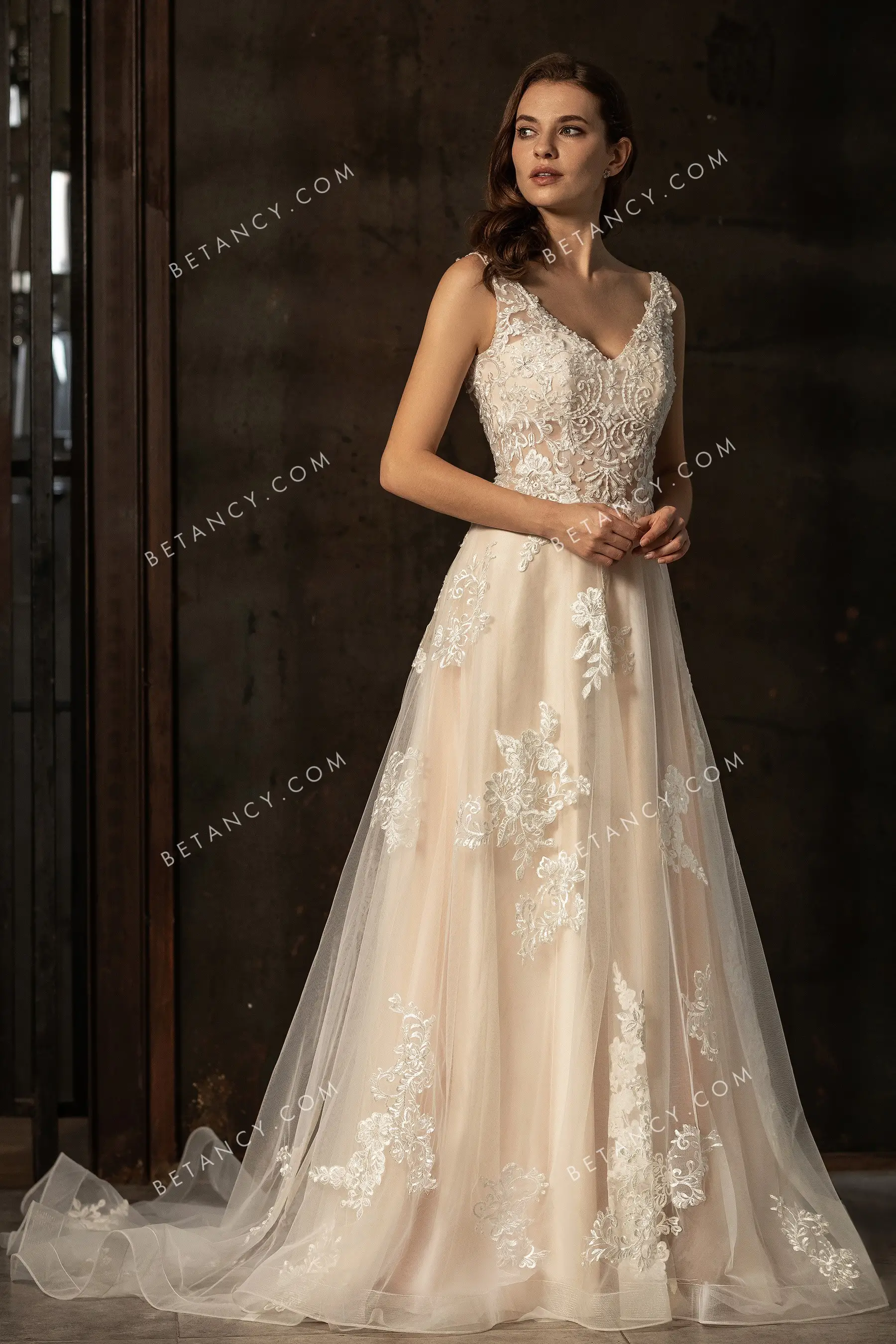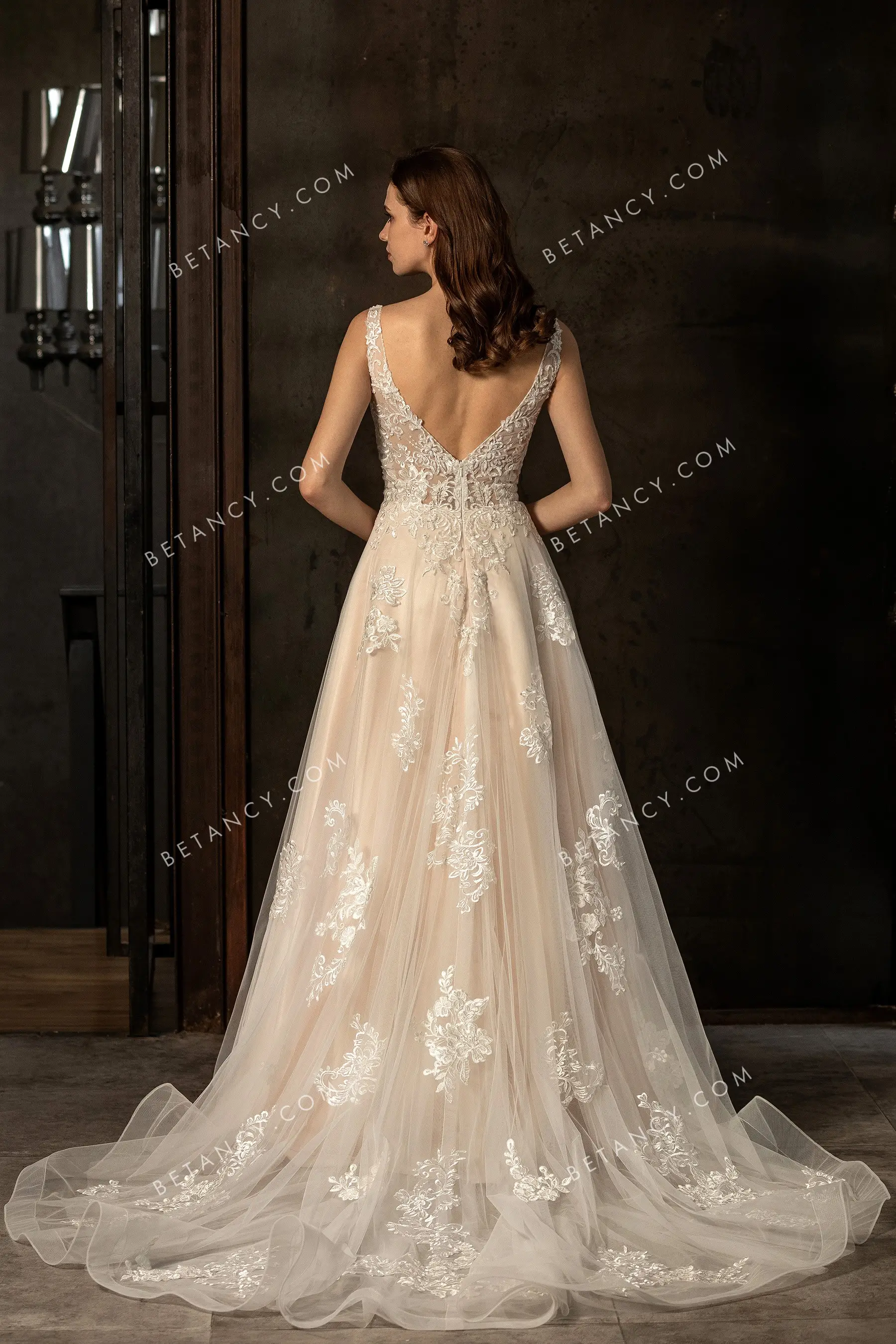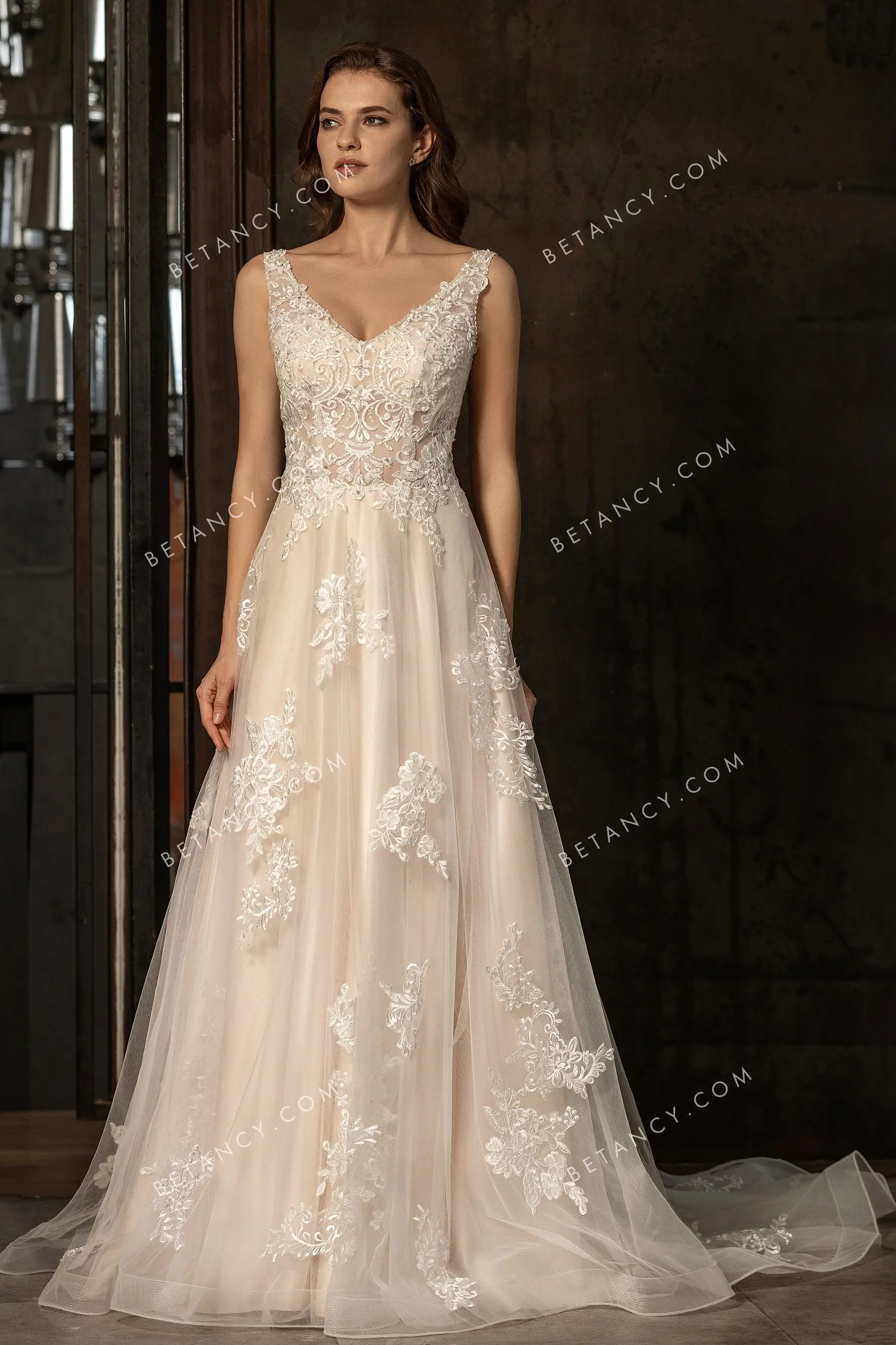 Sophisticated champagne bridal gown with shoulder straps V neckline and modern illusion sheer V back. A-line long skirt adorned with romantic embroidered lace appliques, complete with ruffled horsehair hem at chapel length.