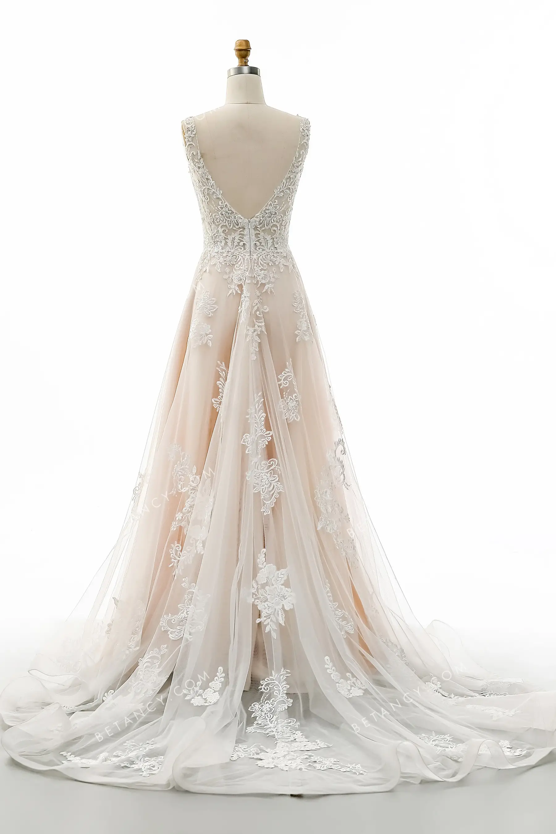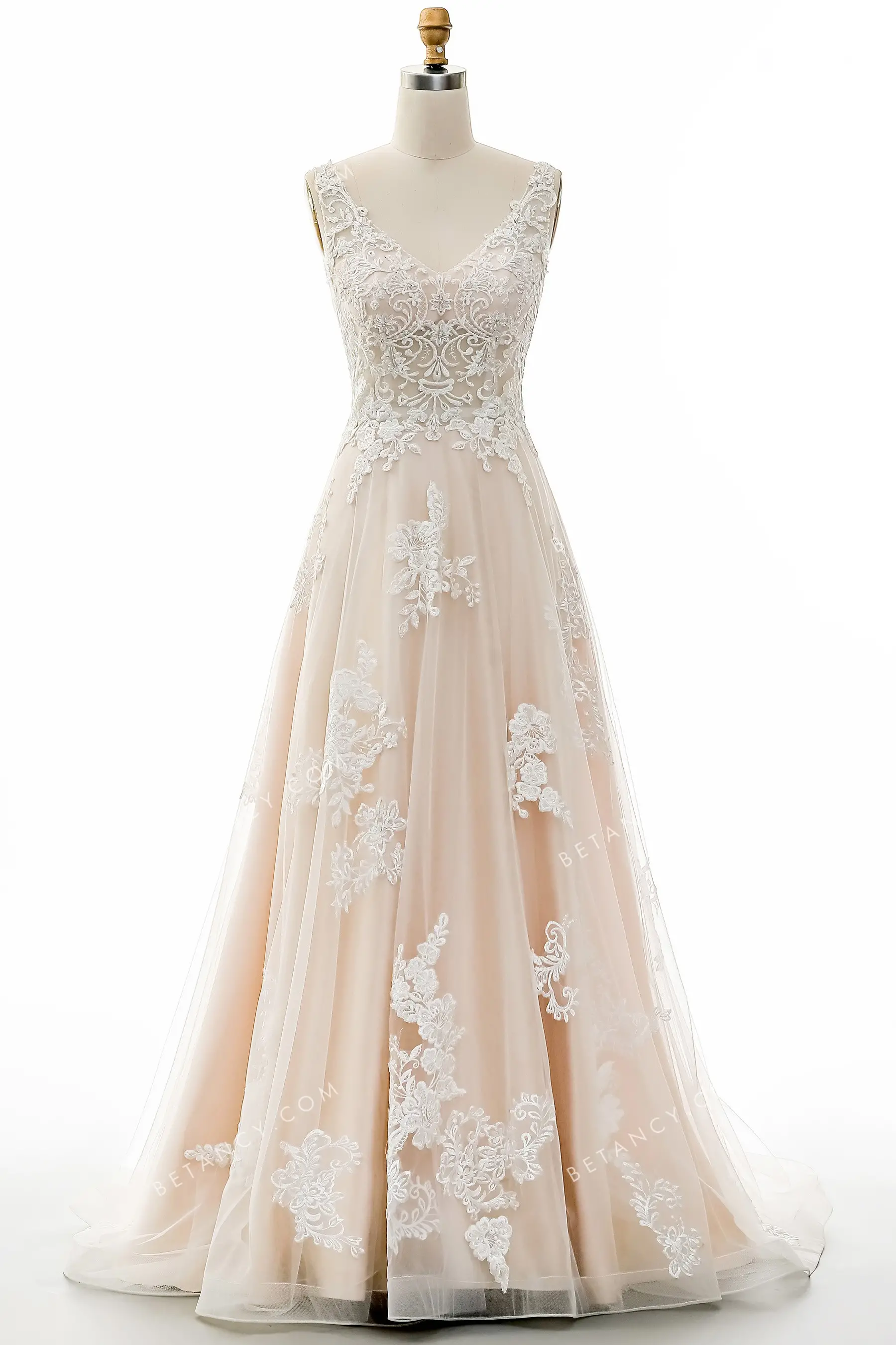 Sophisticated Lace Appliqued Champagne Bridal Gown