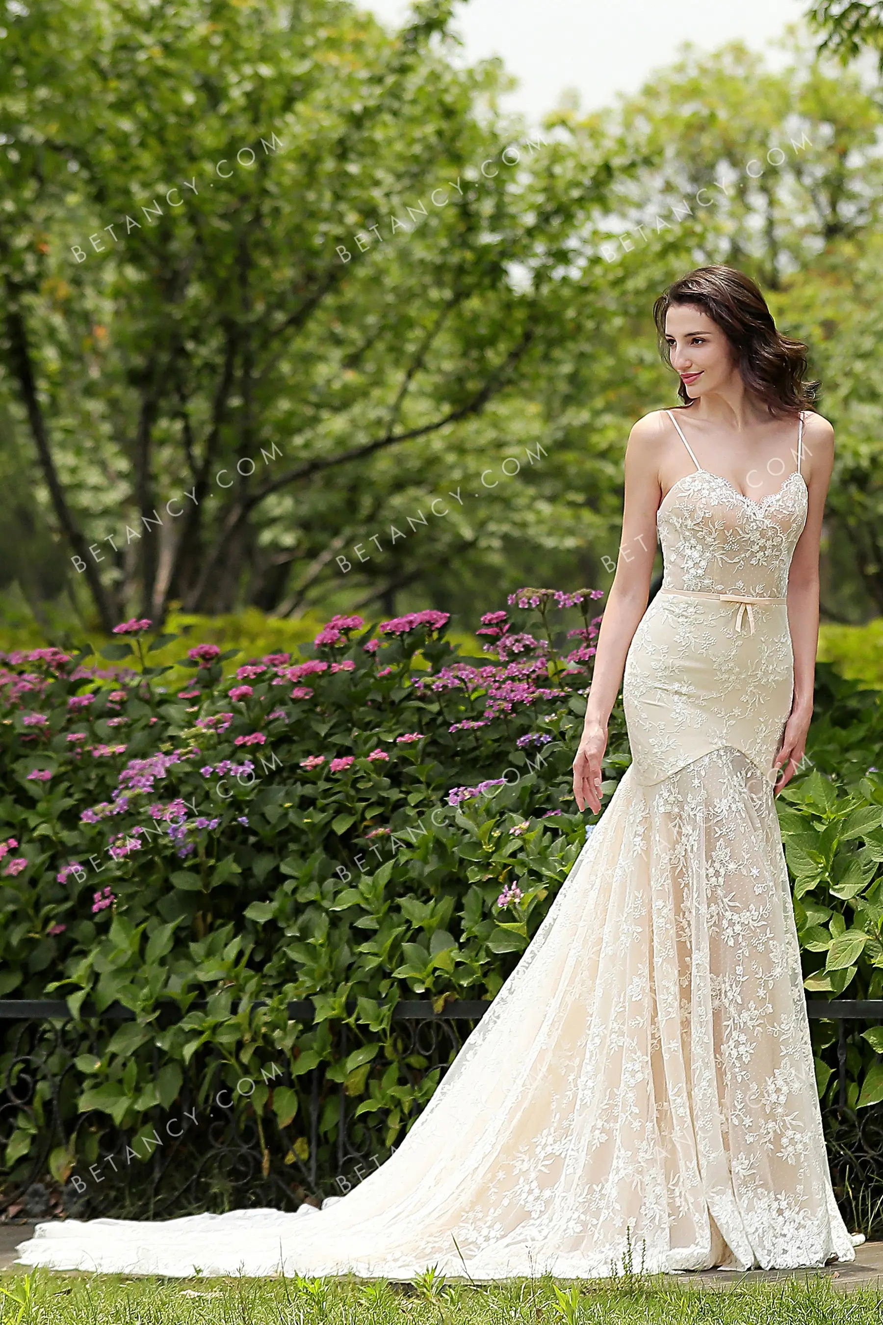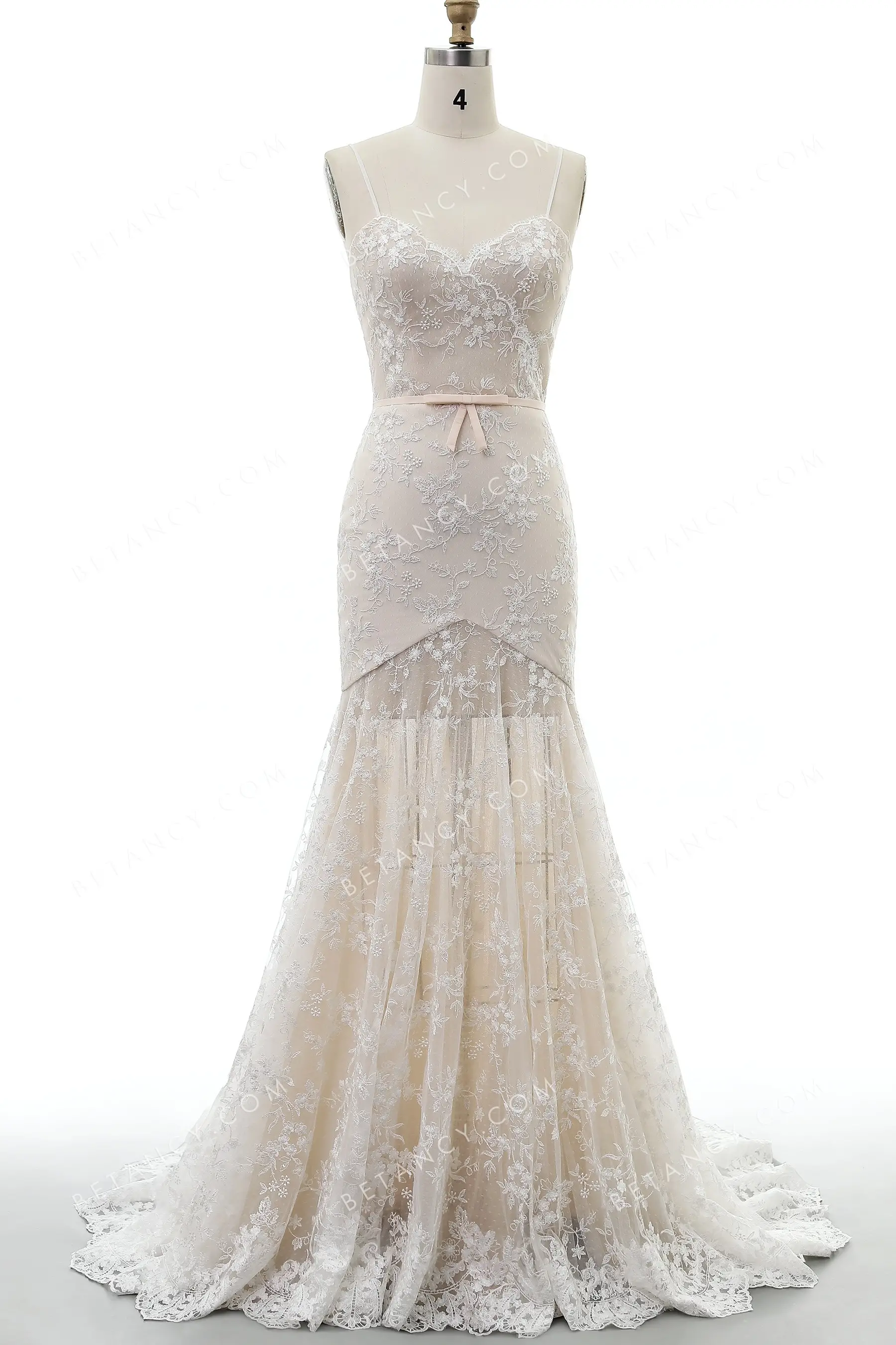 This wholesale elegant nude wedding gown features a cunning spaghetti strap bodice with scallops V neckline, fit-and-flare silhouette accented with sheer delicate floret lace overlaying on a polka dot base.