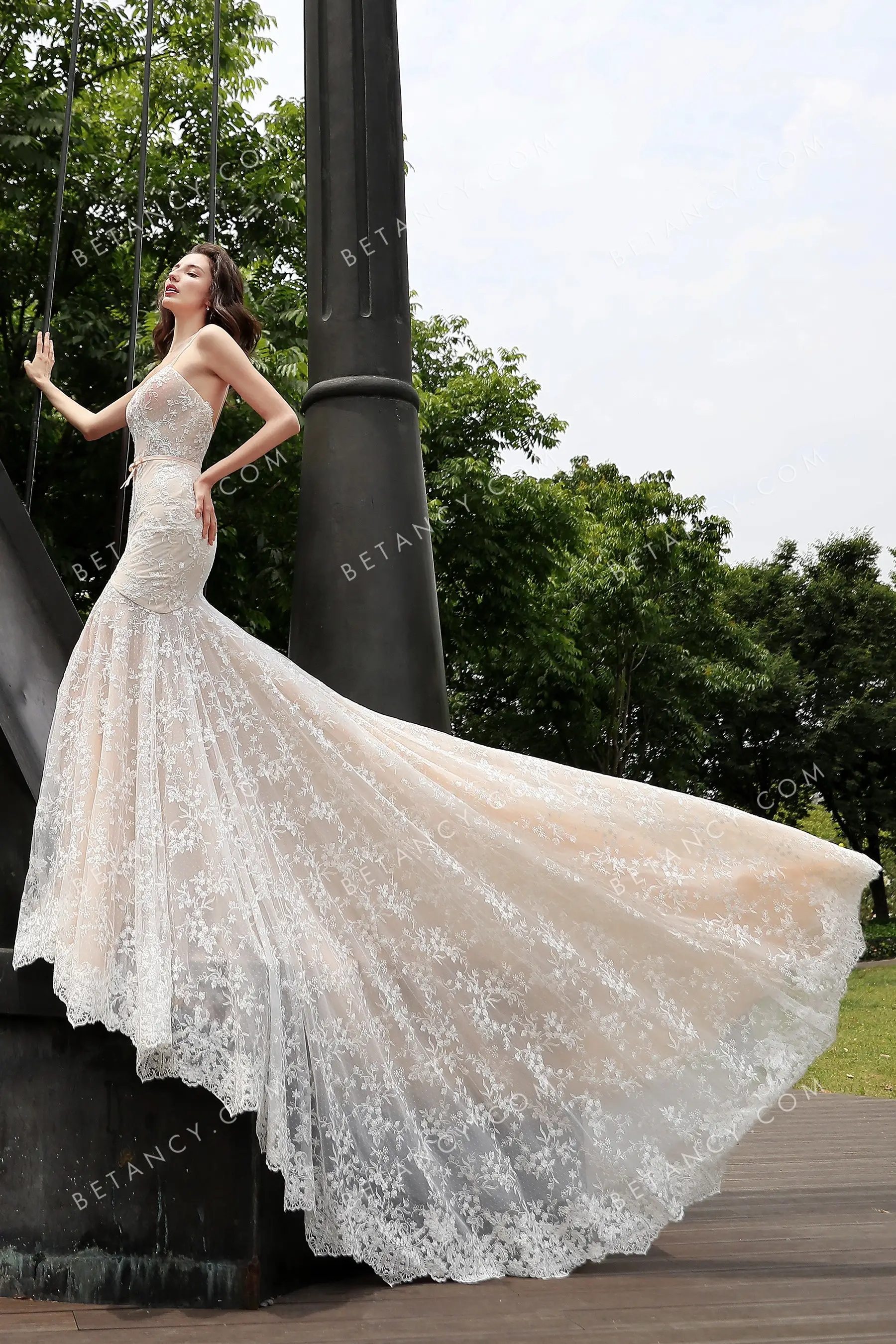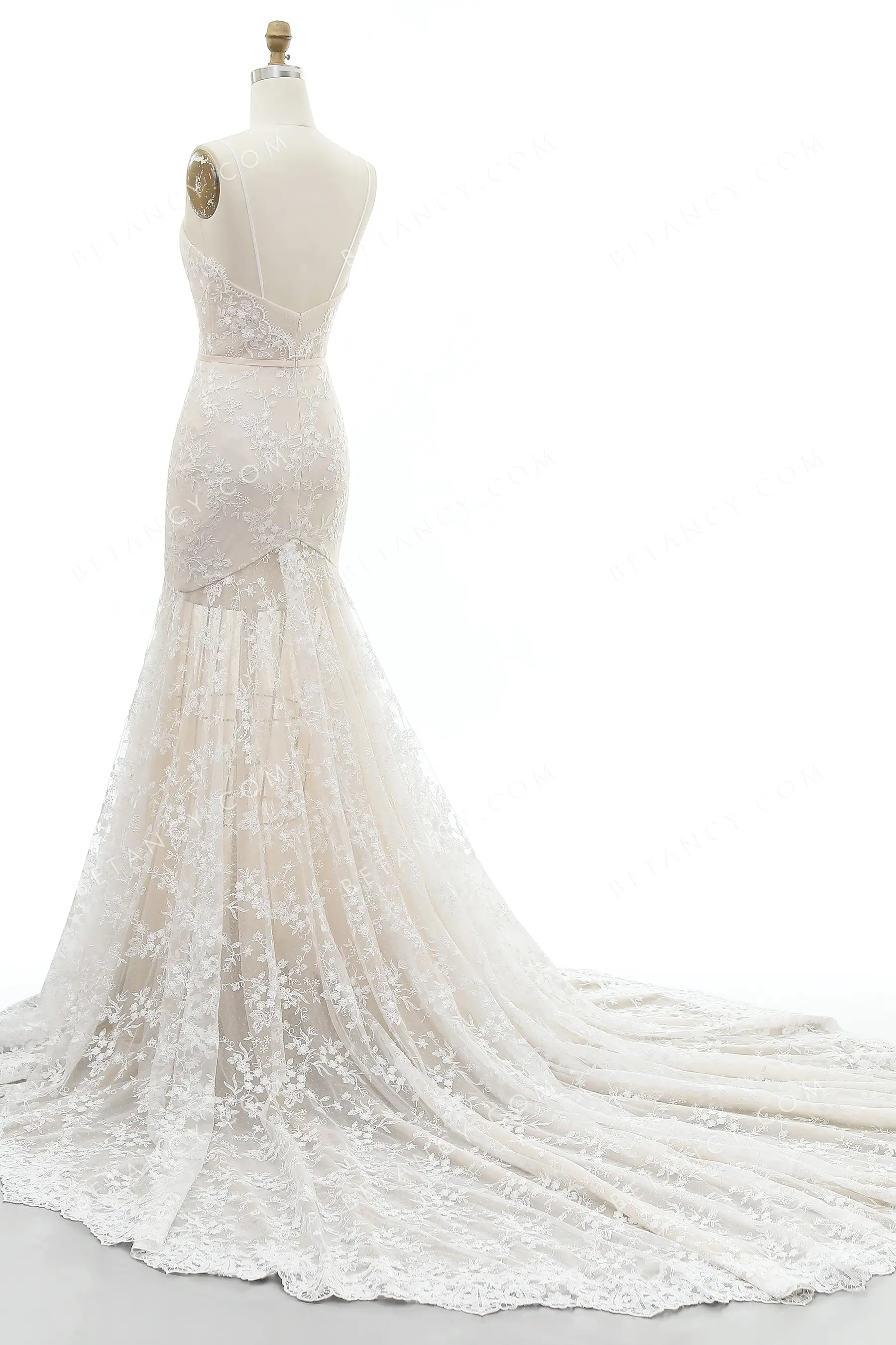 Elegant Nude Sheer Floret Lace Mermaid Wedding Gown