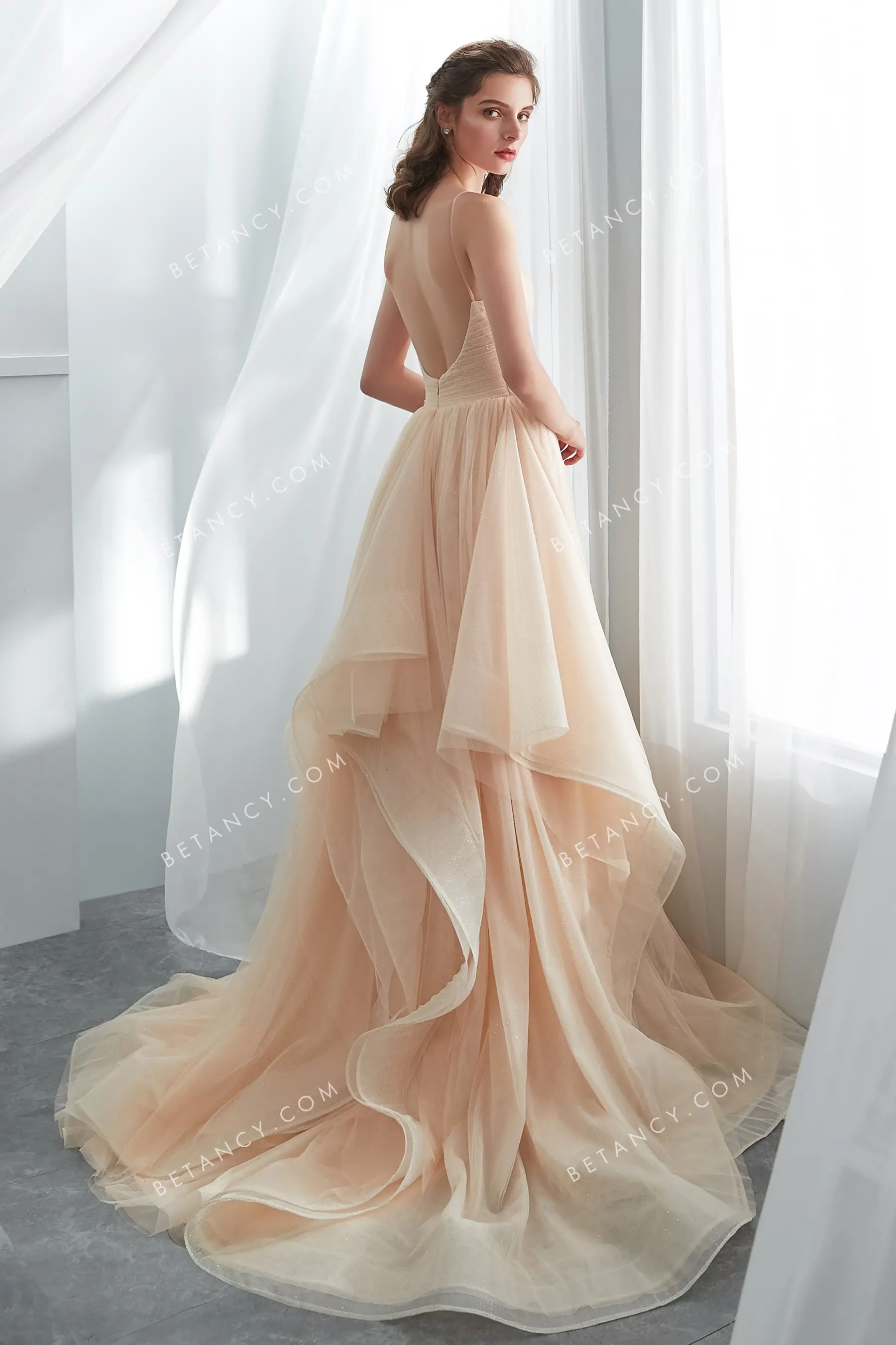 This champagne-colored shimmering spaghetti strap V-neck handmade wholesale wedding gown features a pleated bodice and fabulous soft tulle skirt crafted from asymmetrical layers that provide fullness with ruffled effects.