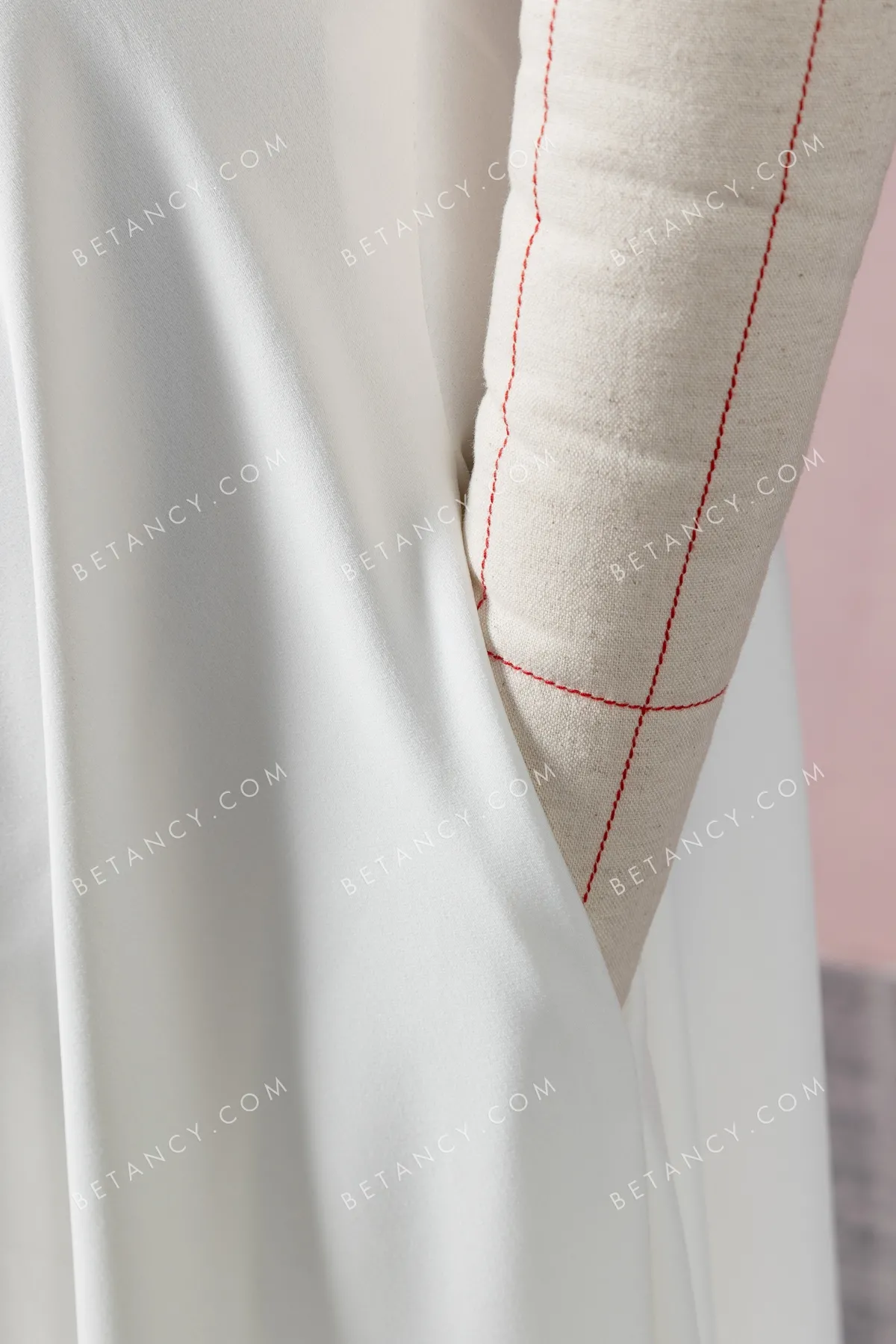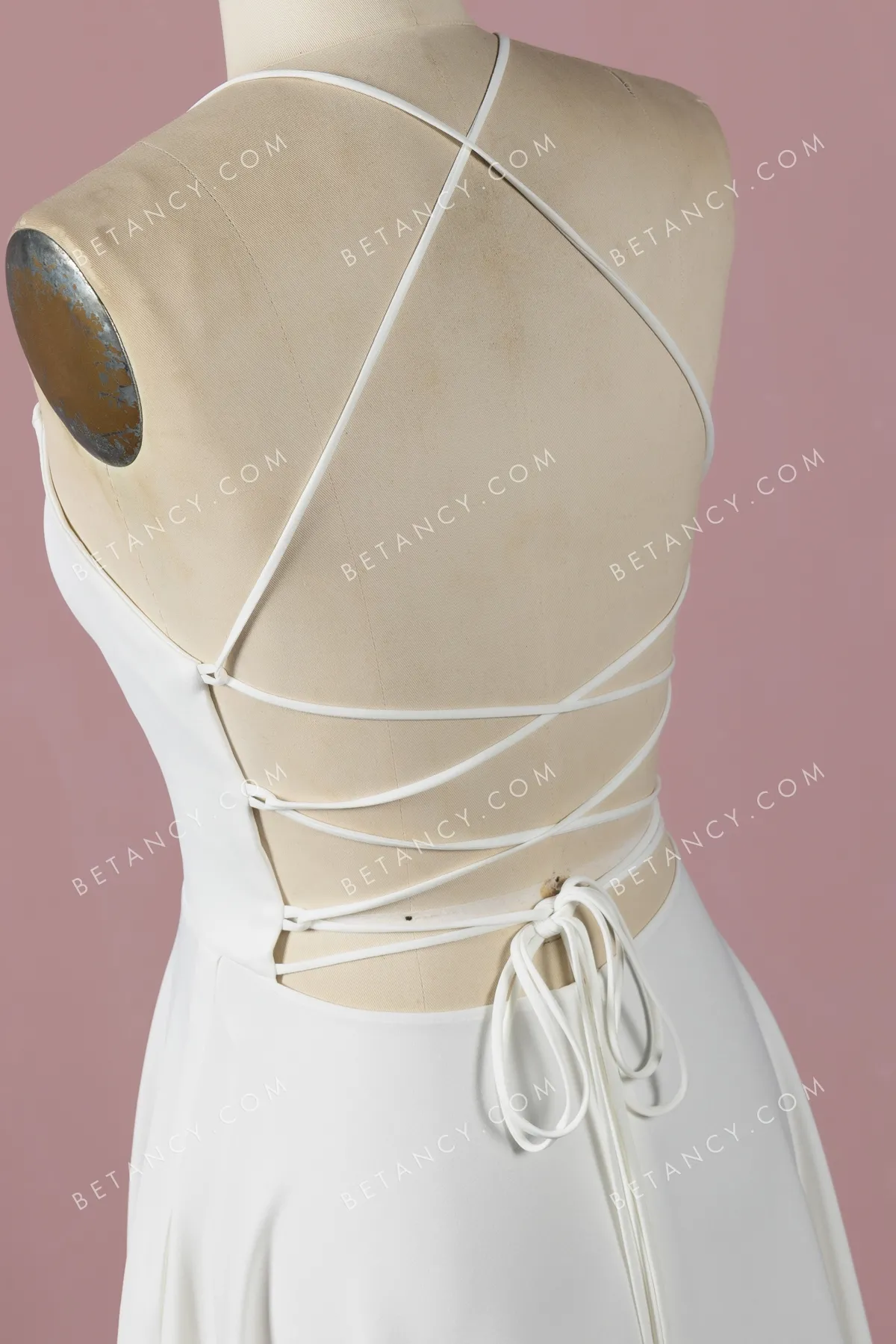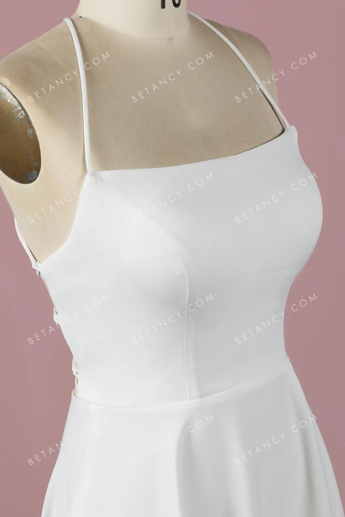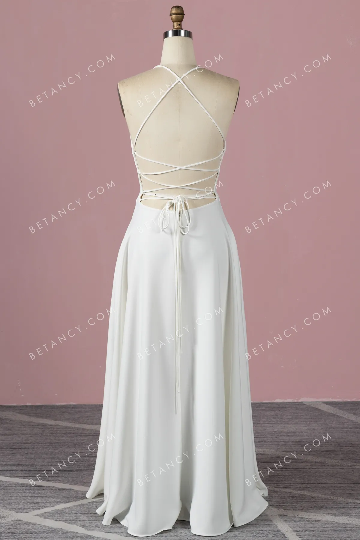 This simple ivory satin bridal dress boasts a sleek and minimalist design with a flowing A-line skirt and a daring low back. The straight neckline features spaghetti straps that tie into a criss-cross pattern, adding a touch of sensuality. A side slit adds a hint of intrigue, revealing the bride's leg with each step. The overall style is chic and contemporary, perfect for a bride who wants to make a bold statement on her wedding day.