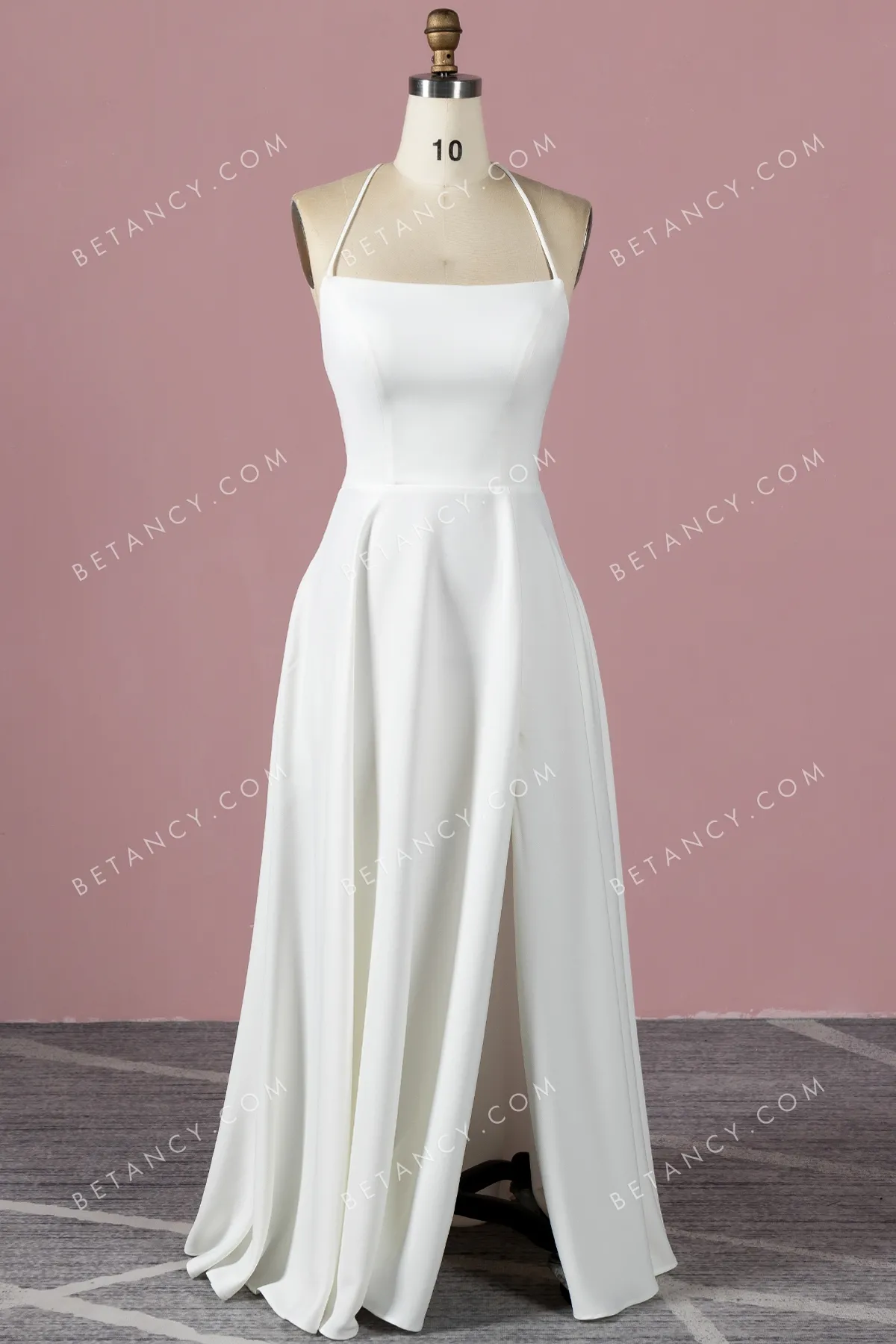 Spaghetti Strap Simple Satin Slit A-line Bridal Dress