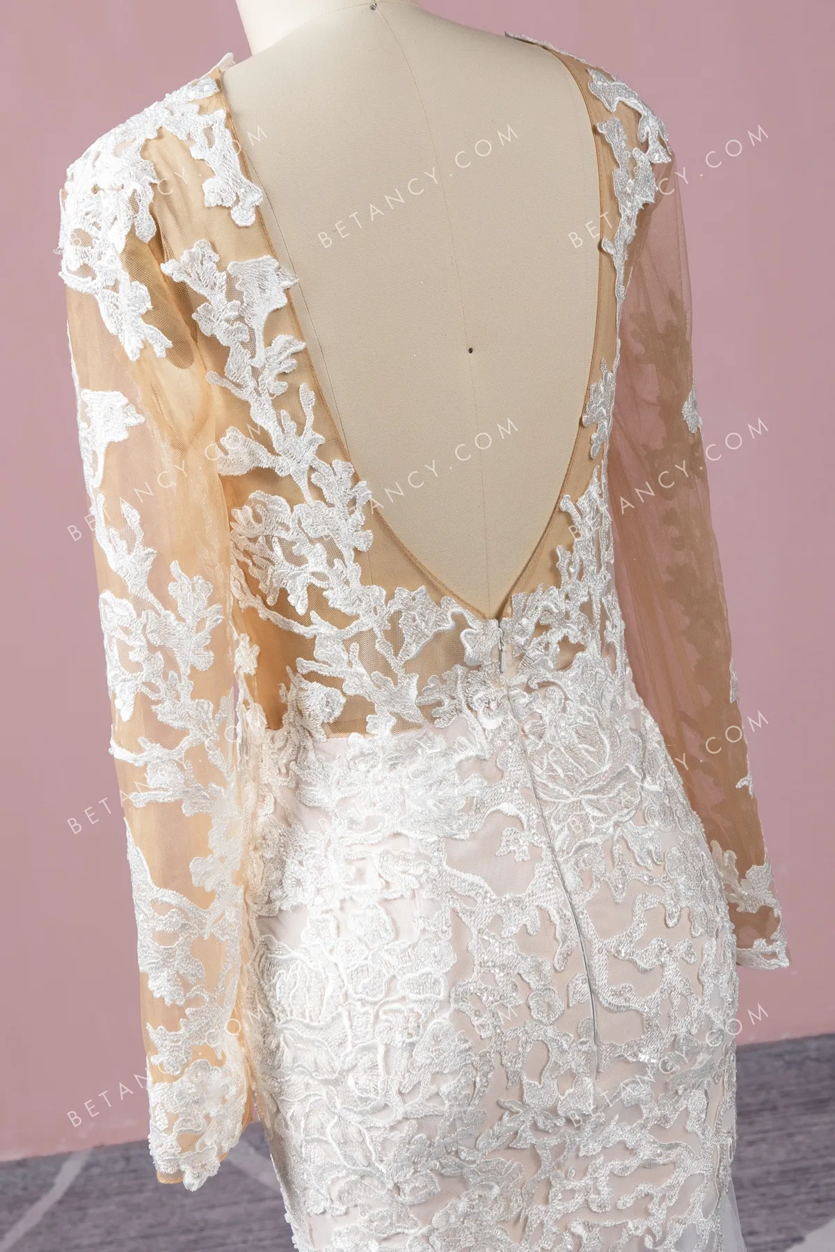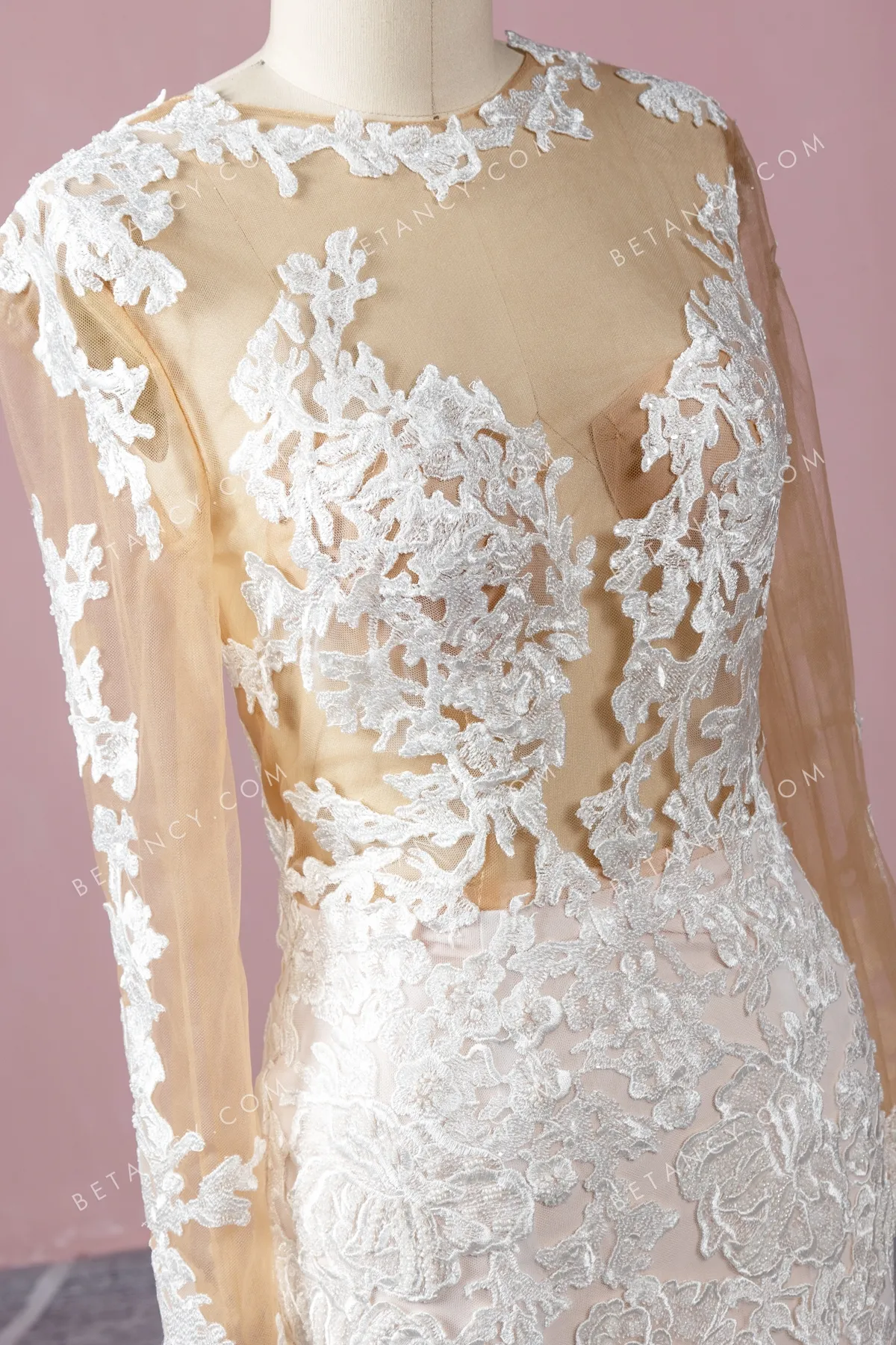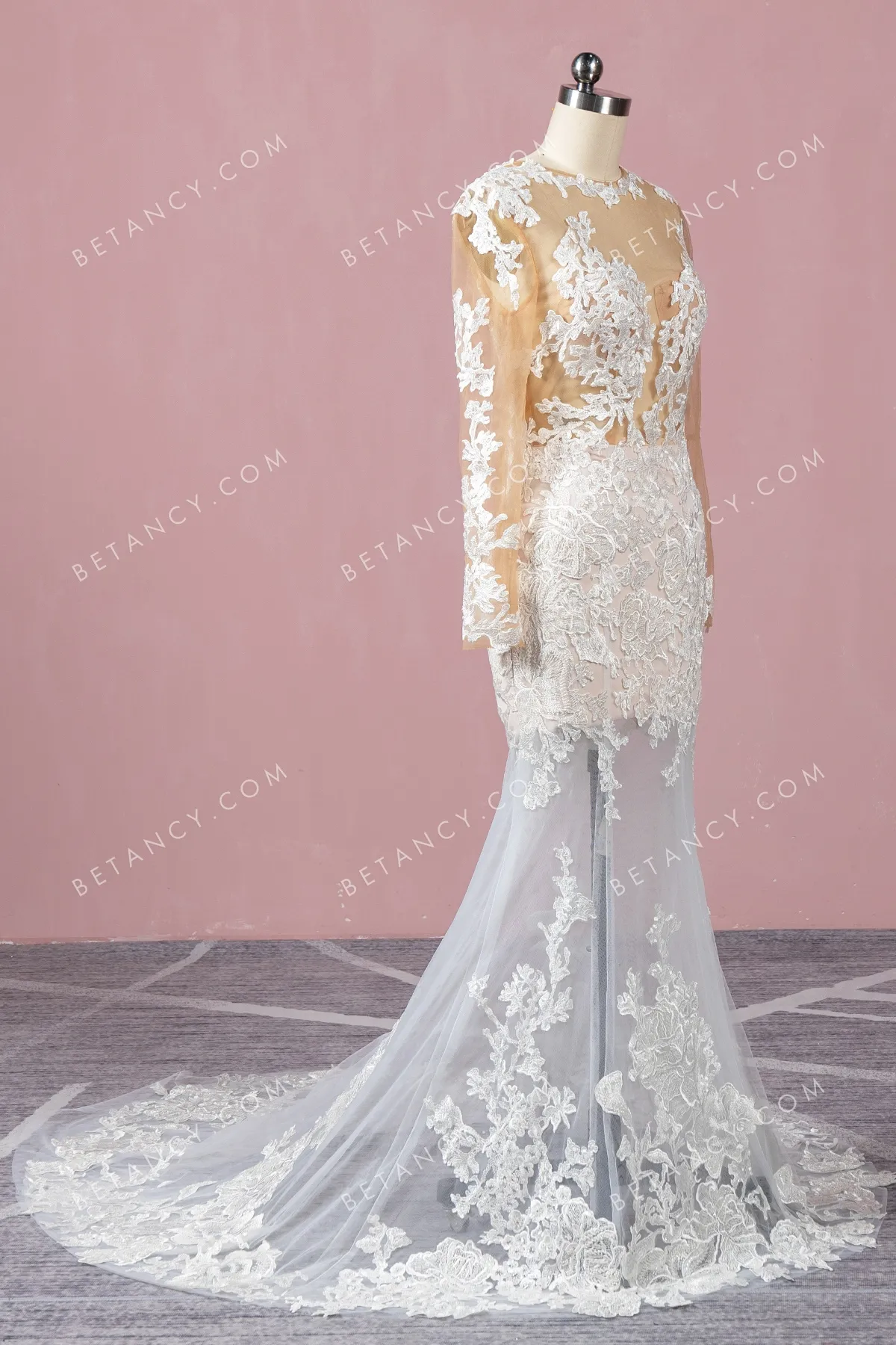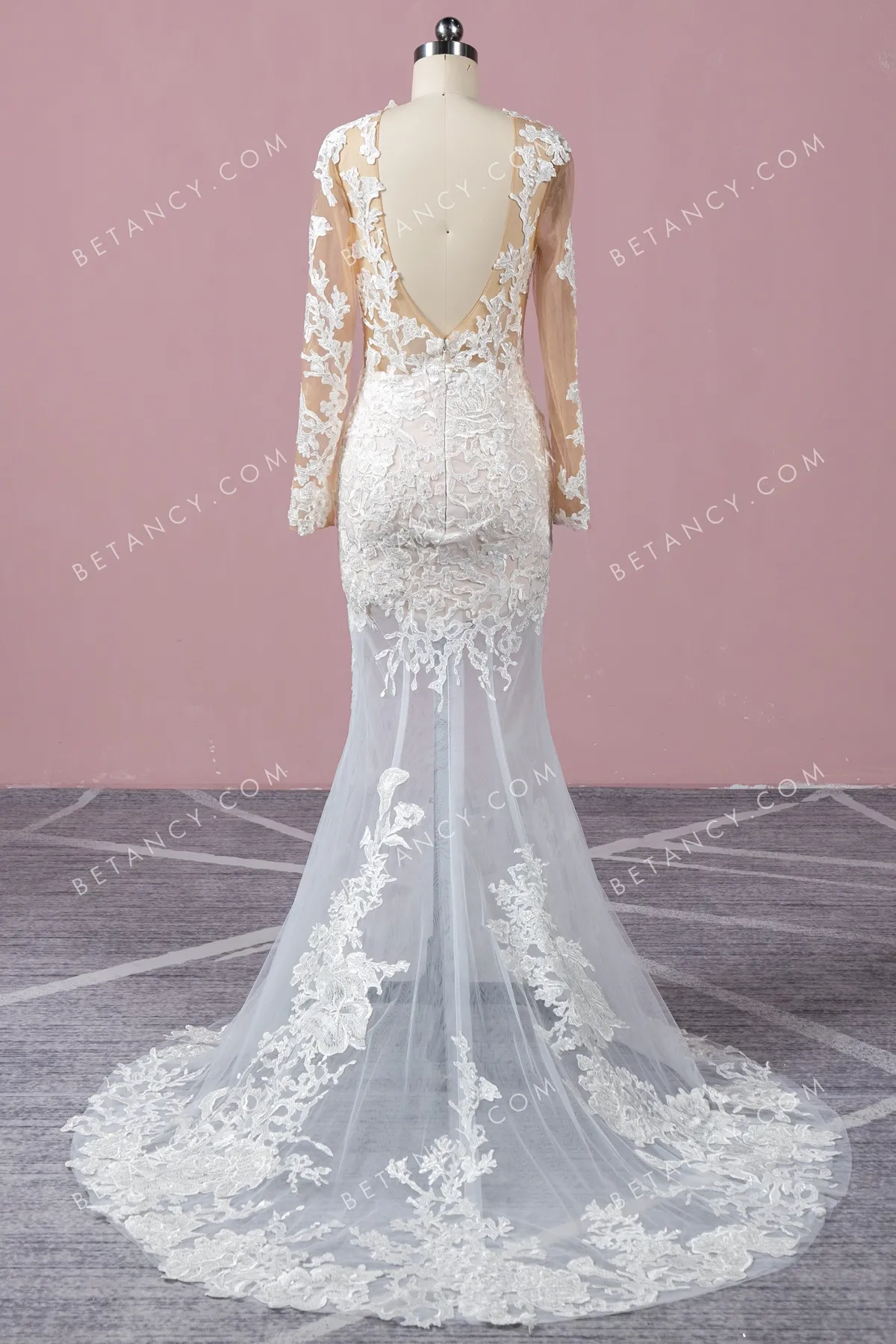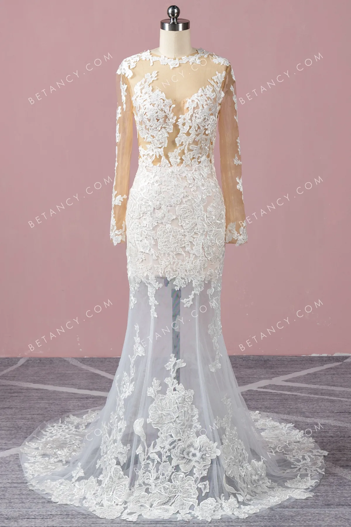 Stunning see-through mermaid lace and tulle wedding gown with a crew neckline and long sheer lace sleeves. The bodice is made of sheer lace and nude tulle, allowing the bride's skin to show through. The skirt is fitted through the hips and flares out into a dramatic court train, creating a glamorous and sexy look. Low back.